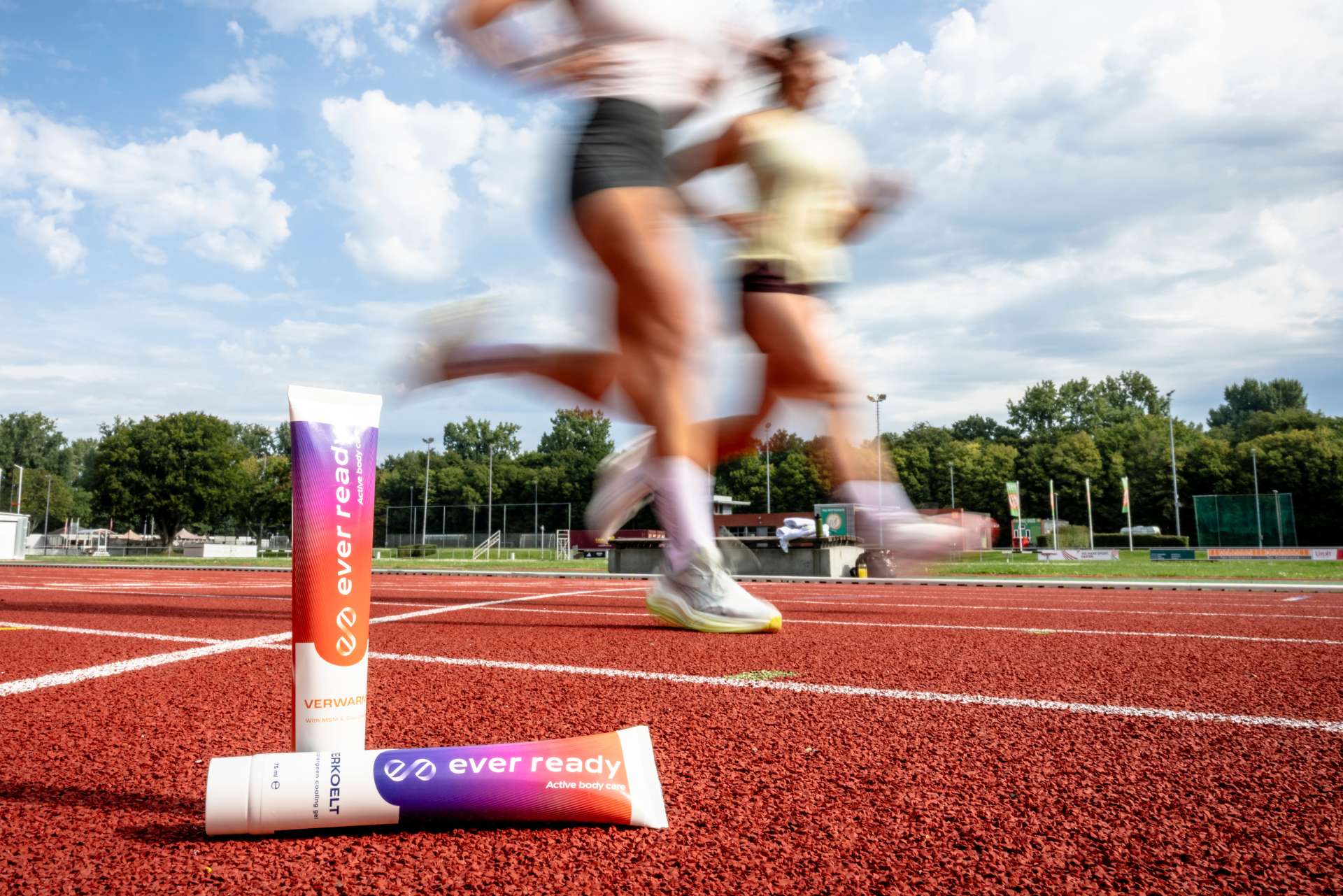 Warmte creme op een atletiekbaan met een hardlopend persoon.